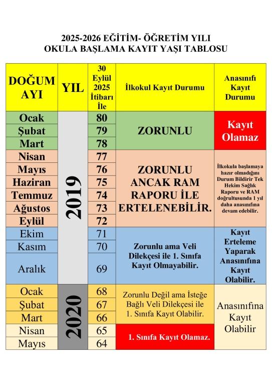 Milli eğitim bakanlığımızın ilkokul için belirlediği okula kayıt yaşı 72 aydan başlamaktadır. 2025-2026 eğitim öğretim yılında 2019 eylül ve öncesi doğan çocuklarımızın ilkokula kaydı zorunludur.